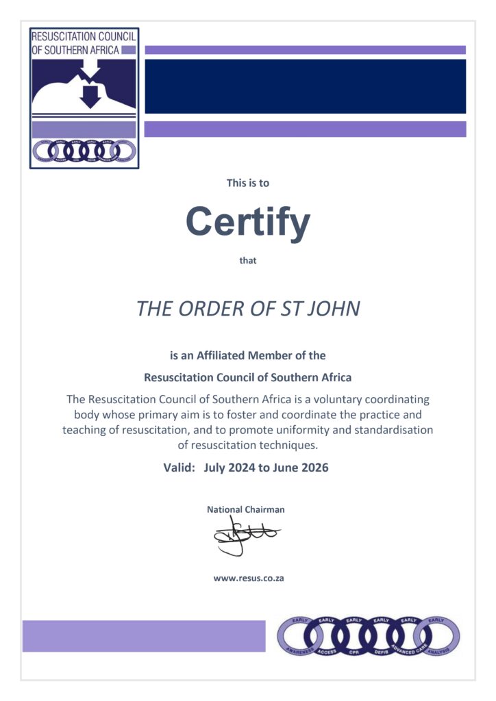 St John South Africa is a proud affiliate member of the Resuscitation Council of Southern Africa (RCSA) and fully accredited to deliver Basic Life Support for Healthcare Providers and CPR training. The RCSA sets rigorous national standards for resuscitation education, ensuring our training is aligned with the latest international guidelines and best practices.